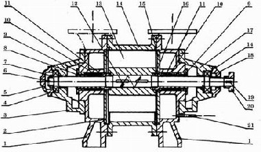 1.端蓋 2.排氣園盤 3.后軸承架 4.軸承 5.后軸承城市蓋 6.軸 7.園螺母 8. 后軸套 9. 填料壓蓋 10.填料壓圈 11.填料 12.平鍵 13. 葉輪 14.泵體 15.吸氣園盤 16.前軸套 17.前軸承架18.前軸承壓蓋 19.平鍵 20.聯(lián)軸器 21.進水管 | ||||||||||||||||||||||||||||||||||||||||||||||||||||||||||||||||||||||||||||||||||||||||||||||||||||||||||||||||||||||||||||||||||||