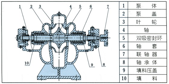 S、SH型單級雙吸泵的主要另件有:泵體、泵蓋、葉輪、軸、雙吸密封環(huán)、軸套、軸承等。除軸的材料為優(yōu)質(zhì)碳素鋼外, 其馀多為鑄鐵制成。