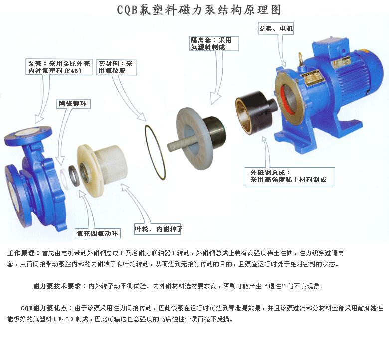 CQB氟塑料磁力泵由泵、磁力傳動(dòng)器、電動(dòng)機(jī)三部分組成。關(guān)鍵部件磁力傳動(dòng)器由外磁轉(zhuǎn)子、內(nèi)磁轉(zhuǎn)子及不導(dǎo)磁的隔離套組成。當(dāng)電動(dòng)機(jī)帶動(dòng)外磁轉(zhuǎn)子旋轉(zhuǎn)時(shí),磁場(chǎng)能穿透空氣隙和非磁性物質(zhì),帶動(dòng)與葉輪相連的內(nèi)磁轉(zhuǎn)子作同步旋轉(zhuǎn),實(shí)現(xiàn)動(dòng)力的無(wú)接觸傳遞,將動(dòng)密封轉(zhuǎn)化為靜密封。由于泵軸、內(nèi)磁轉(zhuǎn)子被泵體、隔離套完全封閉,從而徹底解決了“跑、冒、滴、漏”問題,消除了煉油化工行業(yè)易燃、易爆、有毒、有害介質(zhì)通過泵密封泄漏的安全隱患,有力地保證了職工的身心健康和安全生產(chǎn)。