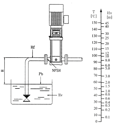 如果泵中的壓力低于輸送液體的蒸汽壓力、可能發(fā)生氣蝕,確保泵進口側有一小壓力,大吸程H[m]可按下式計算: