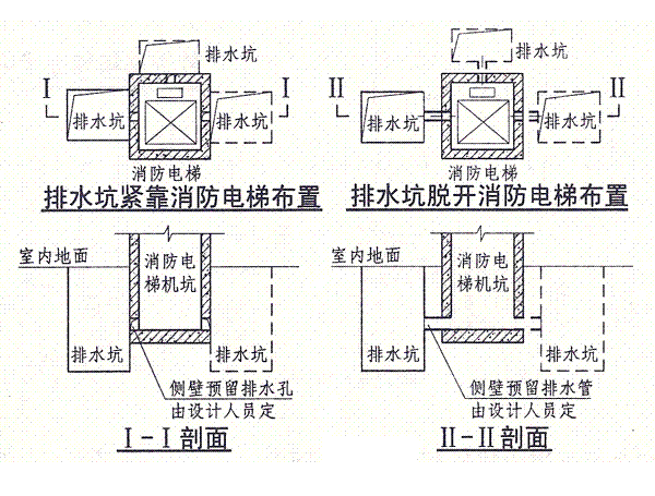 用于消防電梯井排水坑的潛水排污泵安裝方式,應(yīng)采用2臺(tái)硬管鏈接固定式安裝或2臺(tái)固定式自耦式安裝,且排水坑有效容積不小于2.0m3,潛水排污泵的額定流量不小于36m3/h.消防電梯排水坑的平面布置可參照下列形式確定。