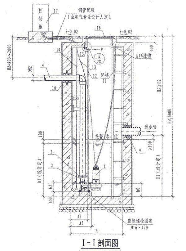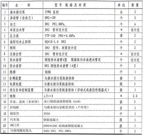 4.潛水排污泵控制柜安裝位置由單項工程設(shè)計考慮,其型號規(guī)格可由泵廠配套供應(yīng)。池外電線電纜應(yīng)穿管敷設(shè)。