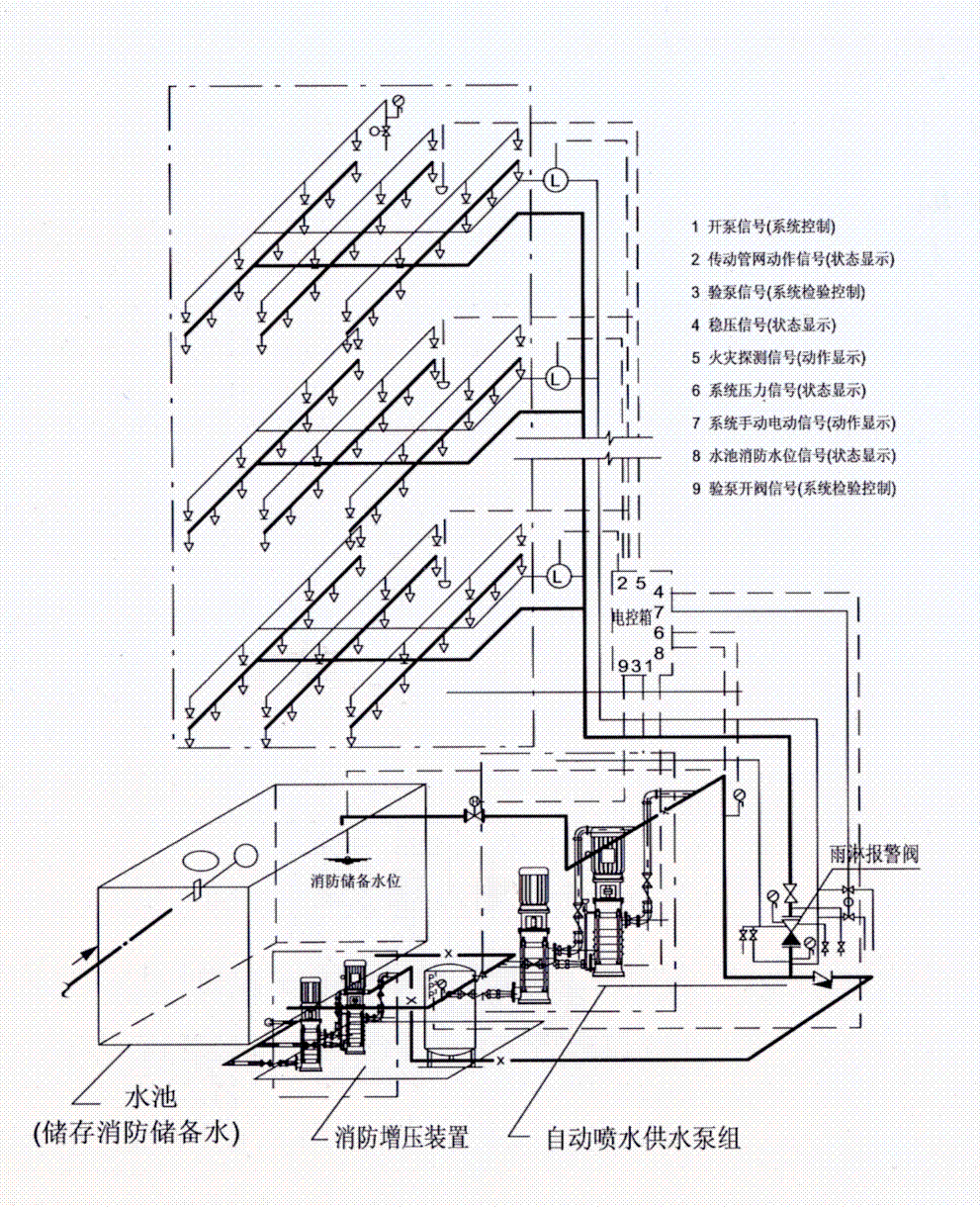 自動噴水濕式系統(tǒng)(高水箱穩(wěn)壓)原理圖