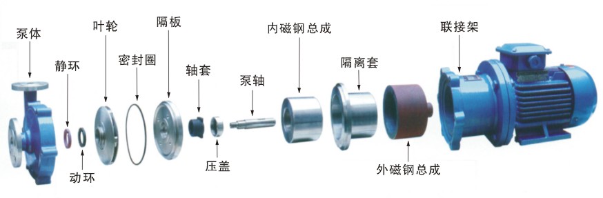 磁力泵主要構件是泵體、葉輪、內(nèi)磁鋼、外磁鋼、隔離套、泵內(nèi)軸、泵外軸以及滑動軸承、滾動軸承、聯(lián)軸器等組成。