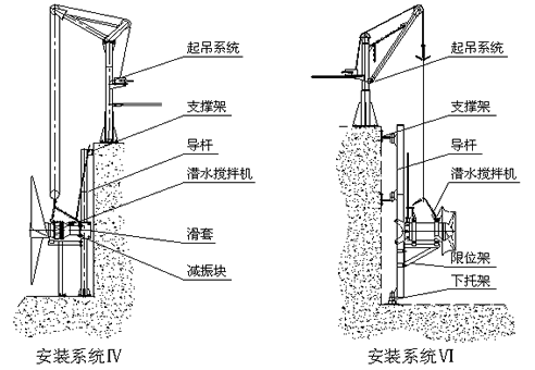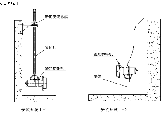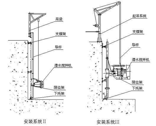 安裝系統(tǒng)Ⅰ只適用池深<4m,機型為QJB0.85/8-260/3-740C和QJB1.5/6-260/3-980C攪拌機,其中Ⅰ-1可在水平方向和垂直方向進行調節(jié);