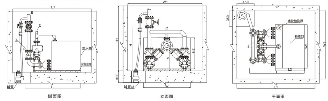 當(dāng)設(shè)備安裝在設(shè)備坑內(nèi)時,設(shè)備應(yīng)配置一臺輔助水泵,目的是為了便于排出意外產(chǎn)生的積水,輔助水泵安裝在設(shè)備旁邊的預(yù)制集水槽內(nèi)。