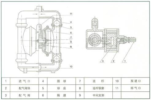 在泵的兩個(gè)對稱各種腔中,各裝有一塊有彈性的隔膜6,聯(lián)桿7將兩塊隔膜結(jié)成一體,壓縮空氣從泵的進(jìn)氣接頭1進(jìn)入配氣閥3后,推動(dòng)兩個(gè)工作腔內(nèi)的隔膜,驅(qū)使聯(lián)桿聯(lián)接的兩塊隔膜同步運(yùn)動(dòng)。與此同時(shí),另一工作腔中的氣體則從其隔膜的背后排出泵外;一旦到達(dá)行程終點(diǎn),配氣機(jī)構(gòu)則自動(dòng)地將壓縮空氣引入另一工作腔,推動(dòng)隔膜朝相反方向運(yùn)動(dòng),這樣就形成了兩個(gè)隔膜的同步往復(fù)運(yùn)動(dòng)。每個(gè)工作腔中又設(shè)置有兩個(gè)單向球閥4,隔膜的往復(fù)運(yùn)動(dòng),造成工作腔內(nèi)容積的改變,迫使兩個(gè)單向球閥交替地開啟和關(guān)閉,從而將液體連續(xù)地吸入和排出。