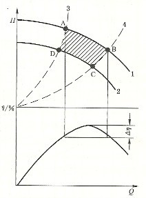 離心泵性能曲線圖上每個點對應(yīng)一個工況,離心水泵在高效率點工作是理想的,但這一要求并不現(xiàn)實,一般是規(guī)定一個工作范圍,如圖2 4中的曲線1巾的AB段,在此范圍內(nèi)泵運行的效率下降不大。通過改變轉(zhuǎn)速或切割葉輪也叫擴大泵的運行機制范圍,曲線2即是改變轉(zhuǎn)速或切割葉輪前后的特性曲絨.曲線3、4是改變轉(zhuǎn)速速的相似拋物線或是切割外徑的切割線(拋物線)。方塊ABCD稱為泵擴大r的工作范圍,泵町以在此范同的任·點工作,而且效率下降多不會超過5%~8%。把許多泵的工作范圍畫在一張坐標圖中.稱為型譜。為了使圖形協(xié)調(diào).高揚程和大流量時的工作范圍不致過大(因高揚程大流量的工作范圍相對變大),通常采用對數(shù)坐標表示。一般每種系列泵有一個型譜。