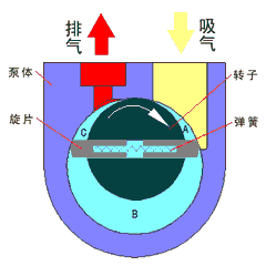 如圖為旋片式真空泵的工作原理示意圖。旋片式真空泵主要由泵體、轉(zhuǎn)子、旋片、端蓋、彈簧等組成。在旋片泵的腔內(nèi)偏心地安裝一個(gè)轉(zhuǎn)子,轉(zhuǎn)子外圓與泵腔內(nèi)表面相切(二者有很小的間隙),轉(zhuǎn)子槽內(nèi)裝有帶彈簧的二個(gè)旋片。旋轉(zhuǎn)時(shí),靠離心力和彈簧的張力使旋片頂端與泵腔的內(nèi)壁保持接觸,轉(zhuǎn)子旋轉(zhuǎn)帶動(dòng)旋片沿泵腔內(nèi)壁滑動(dòng)。