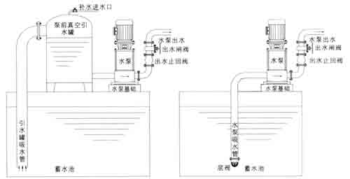 蓄水池吸上引水方式布置的水泵運(yùn)行原理如下右圖,蓄水池一般建于地面以下,而水泵位于地面上,蓄水池水位低于水泵進(jìn)水口,因此,蓄水池內(nèi)的水不能自動(dòng)灌入水泵泵腔,為了使水泵正常工作,在水泵起動(dòng)前必須人工將水灌滿水泵泵腔和水泵吸水管,將泵腔內(nèi)空氣排盡。所以蓄水池內(nèi)水泵的吸水管底端需安裝底閥,但由于市場上一般底閥密封性不是很好,加之水中的顆粒容易進(jìn)入底閥使底閥關(guān)閉不嚴(yán),所以目前采用安裝底閥方式越來越少,大多改為加裝引水罐形式(下左圖),由于加裝了引水罐,不需人工灌引水,且無底閥,使水泵吸水口由負(fù)壓吸水變?yōu)檎龎何,所以水泵運(yùn)行可靠性要高得多。