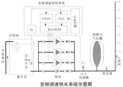 · 變頻調(diào)速供水控制系統(tǒng) 主要由交流變頻調(diào)速器、可編程控制器(微機(jī))、數(shù)字PID調(diào)節(jié)器、外圍操作執(zhí)行機(jī)構(gòu)及保護(hù)電路、壓力傳感器、蓄水池液位控制器(水源缺水保護(hù)用)等組成。