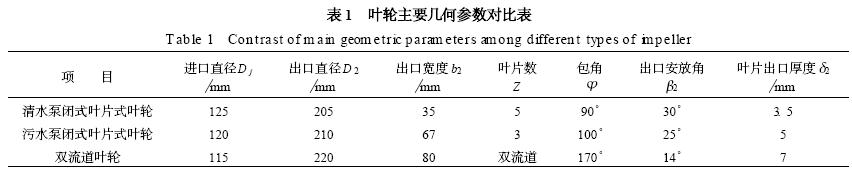 通過對一個(gè)實(shí)例的設(shè)計(jì)來進(jìn)行分析、比較, 其設(shè)計(jì)參數(shù)為: 流量Q = 145m 3/h , 揚(yáng)程H = 10m , 轉(zhuǎn)速n =1 450 r/m in, 電機(jī)功率P 電機(jī)= 7. 5 kW , 要求通過固體顆粒的大直徑為45 mm。為了便于說明問題, 對于閉式葉片式葉輪分別給出了按普通清水泵及污水泵的設(shè)計(jì)結(jié)果。所有的水力設(shè)計(jì)均采用速度系數(shù)法進(jìn)行, 其中閉式葉片式葉輪的設(shè)計(jì)方法參見文獻(xiàn), 雙流道葉輪的設(shè)計(jì)方法參見文獻(xiàn)。表1 列出了上述葉輪主要幾何參數(shù)的對比情況。