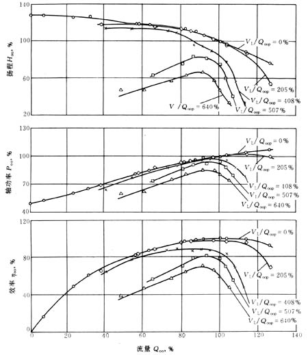 輸送含氣液體時(shí),泵的流量、揚(yáng)程、效率均有所下降,含氣量愈大,下降愈快(見圖