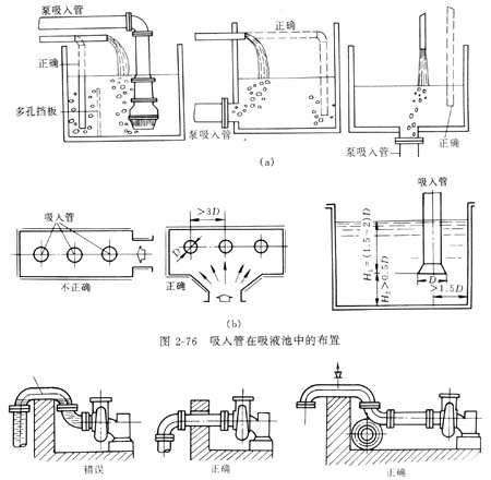 (2)吸液池的進(jìn)液管、回流管、廢液收集管要遠(yuǎn)離泵的吸入管口,以免空氣泡在沒有消失之前就很快被泵吸入,同時(shí)吸入管不能放在池中央,也不能太靠近池壁(一般離池壁小為1.5D),以免產(chǎn)生旋渦或抽空(見圖2-76)。