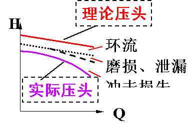 實(shí)際生產(chǎn)中,A、葉片時有限的,液體流動時會產(chǎn)生與流動方向不一致的“軸向渦流”→H↓;B、實(shí)際流體與葉輪、泵殼等流道上的元件間不可避免的能量損失→H↓;C、泵內(nèi)各種泄漏損失:高壓液體的部分回流、平衡孔的回流液、軸封處的泄漏→Q↓。