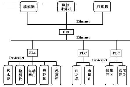 監(jiān)控計算機、污水泵房控制PLC、雨水泵房控制PLC、變電所自動化系統(tǒng)的數(shù)據(jù)集總器等設備采用工業(yè)以太網(wǎng)(Ethernet)相互連接。PLC與水泵、閘門等機械設備的控制箱之間采用DeviceNet總線相互連接。儀表的模擬量和脈沖量信號則通過遠端I/O模塊轉(zhuǎn)接入DeviceNet。