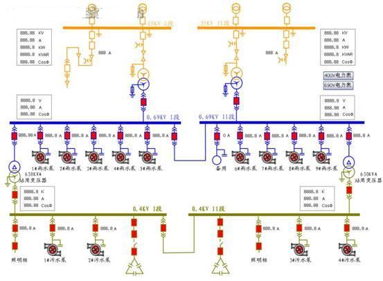 信息層位于中央控制室,利用易控(INSPEC)組態(tài)軟件設計完成整個監(jiān)控系統(tǒng)的圖形界面,以及監(jiān)控數(shù)據(jù)報表等?蓪θ谜旧a(chǎn)數(shù)據(jù)進行收集以及集中控制,設有上位機2臺(工程師站、操作員站各一臺)以及相關(guān)打印機與不間斷電源UPS,上位機通過以太網(wǎng)與PLC分站連接;設有模擬屏,顯示全泵站的電力監(jiān)控情況。
