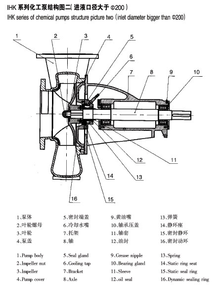 IHK型化工離心泵是在IH型化工泵的基礎(chǔ)上改進而成的,在密封機構(gòu)上引進了國外先進技術(shù),改變了IH泵只能輸送物理性能類似水的介質(zhì)(無雜質(zhì)的顆粒)的弊端,由于密封技術(shù)先進、科學(xué)、獨特,該泵可輸送含固量高達(dá)35%以下的物料;在正常情況下連續(xù)工作8000小時無泄漏,是IH泵密封效果的3-5倍,又因葉輪為開式結(jié)構(gòu),所以不會因介質(zhì)含固量高而堵塞,該泵是目前化工行業(yè)輸送各種物料的理想的先進設(shè)備。