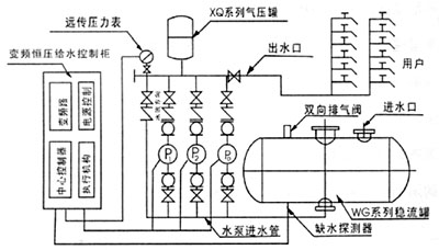 由于真空補償器的作用,罐體內(nèi)部在任何工作狀態(tài)下都保持正壓,避免了水泵直接抽取自來水管網(wǎng)的水,保護了水泵,避免了用戶缺水。主要是通過以下過程來實現(xiàn)的:自來水不斷進入罐體時,隨著水位不斷升高,罐體內(nèi)的空氣經(jīng)真空補償器自動排出。當水位上升到一定水位時,真空補償器自動關(guān)閉,此時自來水仍不斷進入,罐體內(nèi)部壓力逐漸增大,直至終罐內(nèi)的壓力等于自來水管網(wǎng)的壓力。當用戶用水增大或者自來水管網(wǎng)流量壓力變小時,罐體內(nèi)部水位會逐漸下降,當水位下降到一定值時真空補償器自動打開,接通大氣,罐體內(nèi)無負壓,水泵抽取罐體內(nèi)的水。當用戶用水量大、自來水管量小或者自來水停水時,罐體上的液位控制器控制水泵的;蜷_。