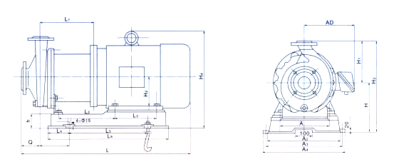 采用磁力傳動(dòng)原理及設(shè)置水冷卻裝置無泄漏輸送腐蝕性高溫介質(zhì)。