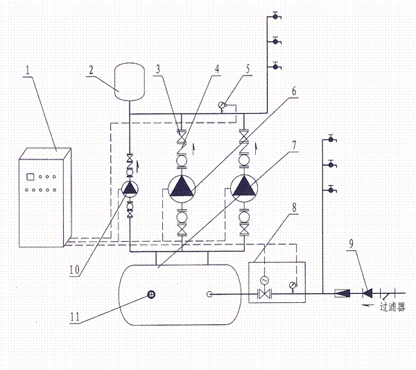供水設備是我公司技術人員結合多年管網疊壓供水設備研究經驗設計而成的新一代智能型成套無負壓穩(wěn)流給水設備,采用智能變頻控制柜控制。其組成及工作原理如下圖: