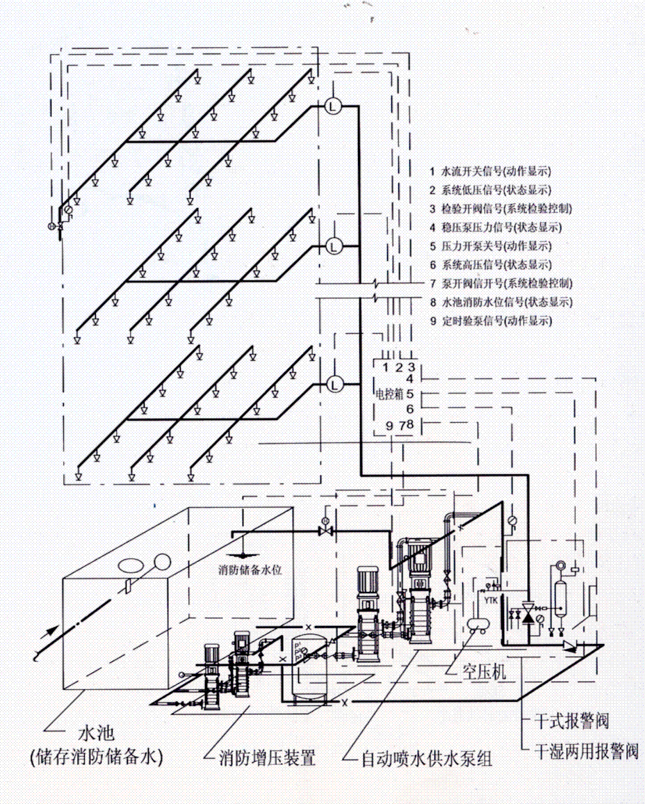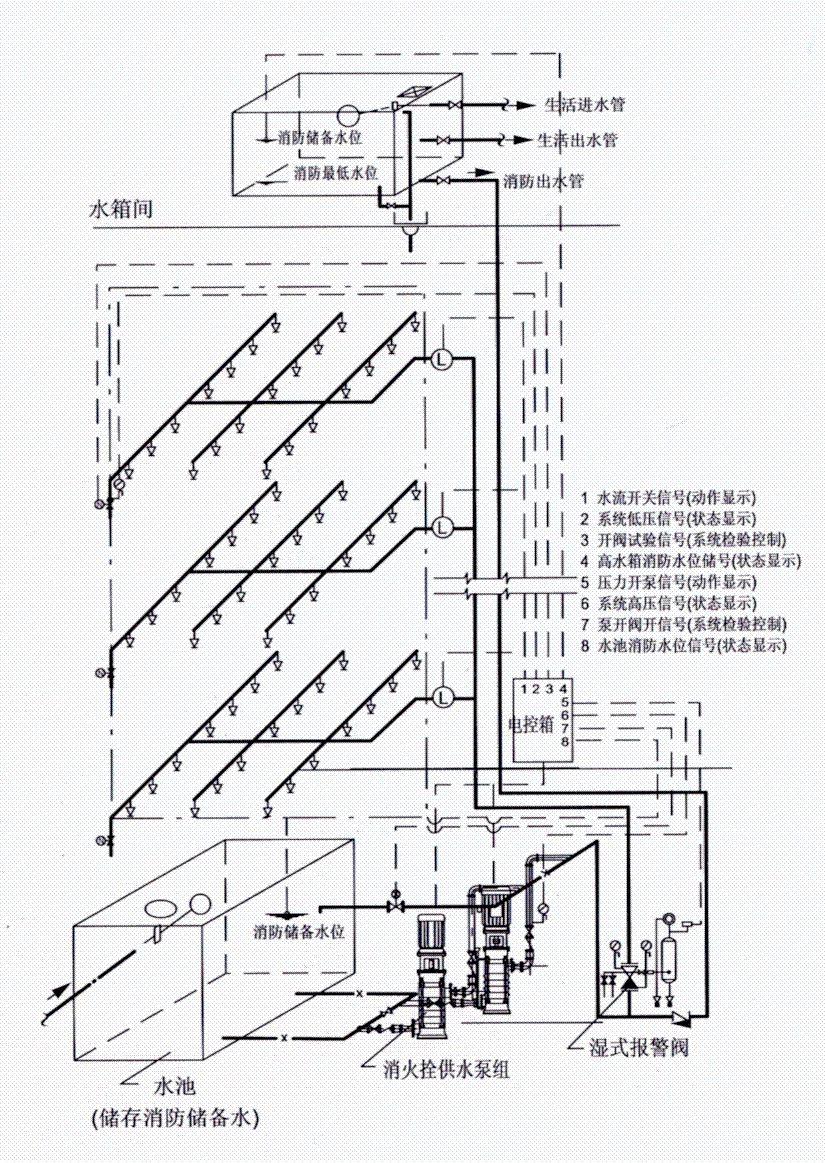自動噴水濕式系統(tǒng)(高水箱穩(wěn)壓)原理圖
