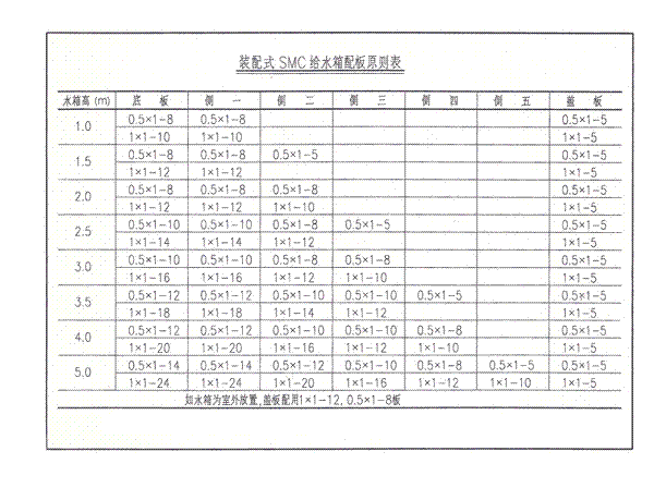 注:1、裝配式SMC給水箱單板型號(hào)為MT-SB-XxY-Z其中(X為單板長(zhǎng)度m,Y為單板狂度m,Z為單板厚度mm),表中各種板型省略“MT-SB-”.