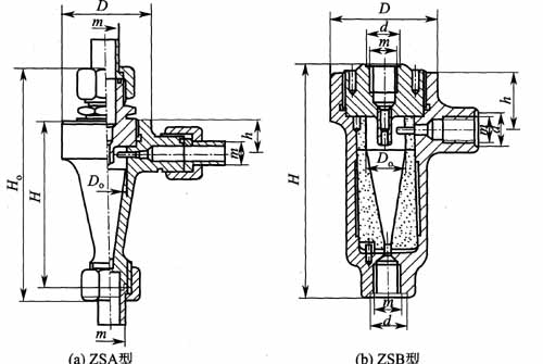 ②旋液分離器  旋液分離器(簡稱旋液器)是利用離心沉降原理來分離固體顆粒(顆粒密度大于化工泵密封流體的密度)的器件,其分離精度可達微米級。我國機械行業(yè)標(biāo)準(zhǔn)JB/T6633-1993《機械密封系統(tǒng)用旋液器》規(guī)定的機械密封系統(tǒng)用旋液器分為ZSA型與ZSB型兩種形式(見圖5-90),其工作參數(shù)為:壓力范圍0.4~6.3MPa;工作溫度為-20~200℃;工作流量2~8 L/min;工作介質(zhì)為含固相顆粒的液體。
